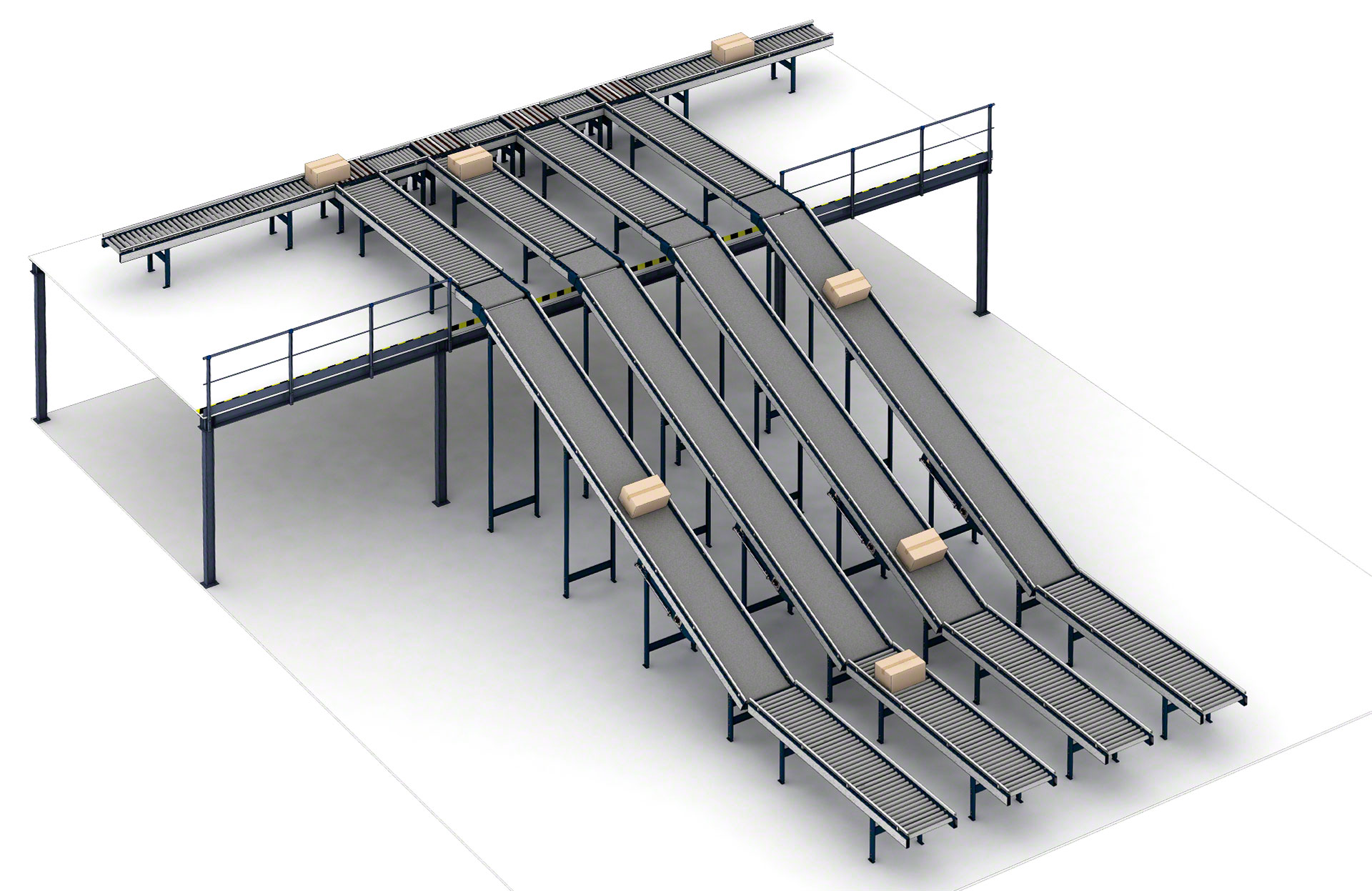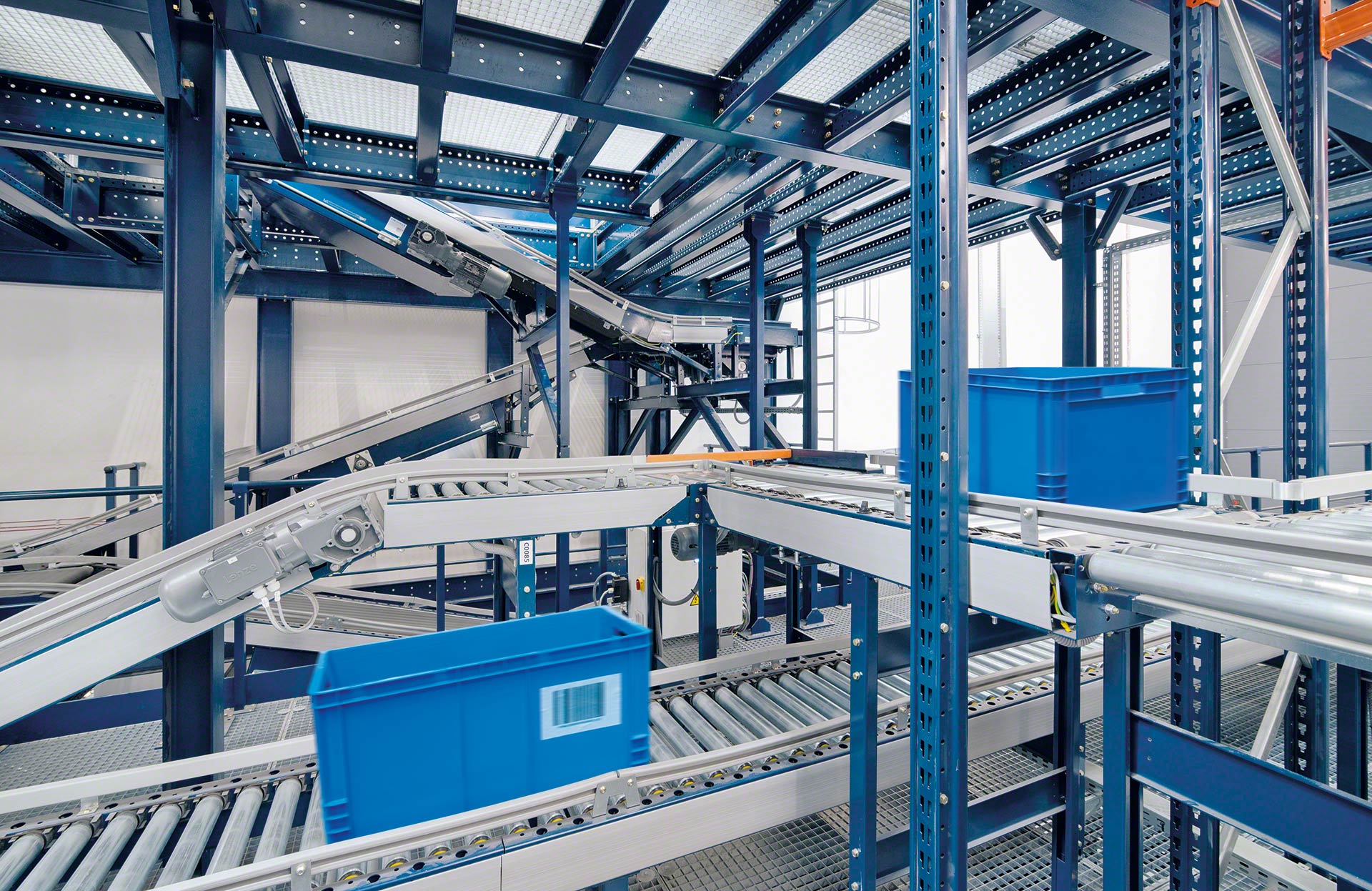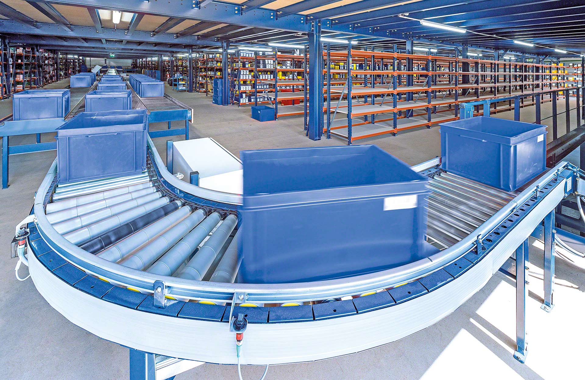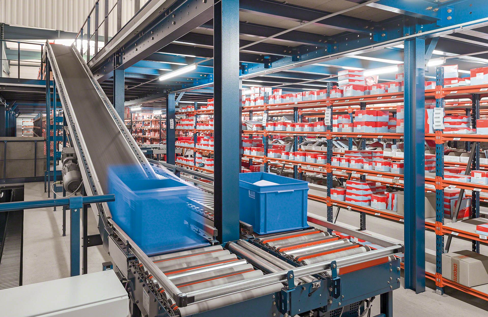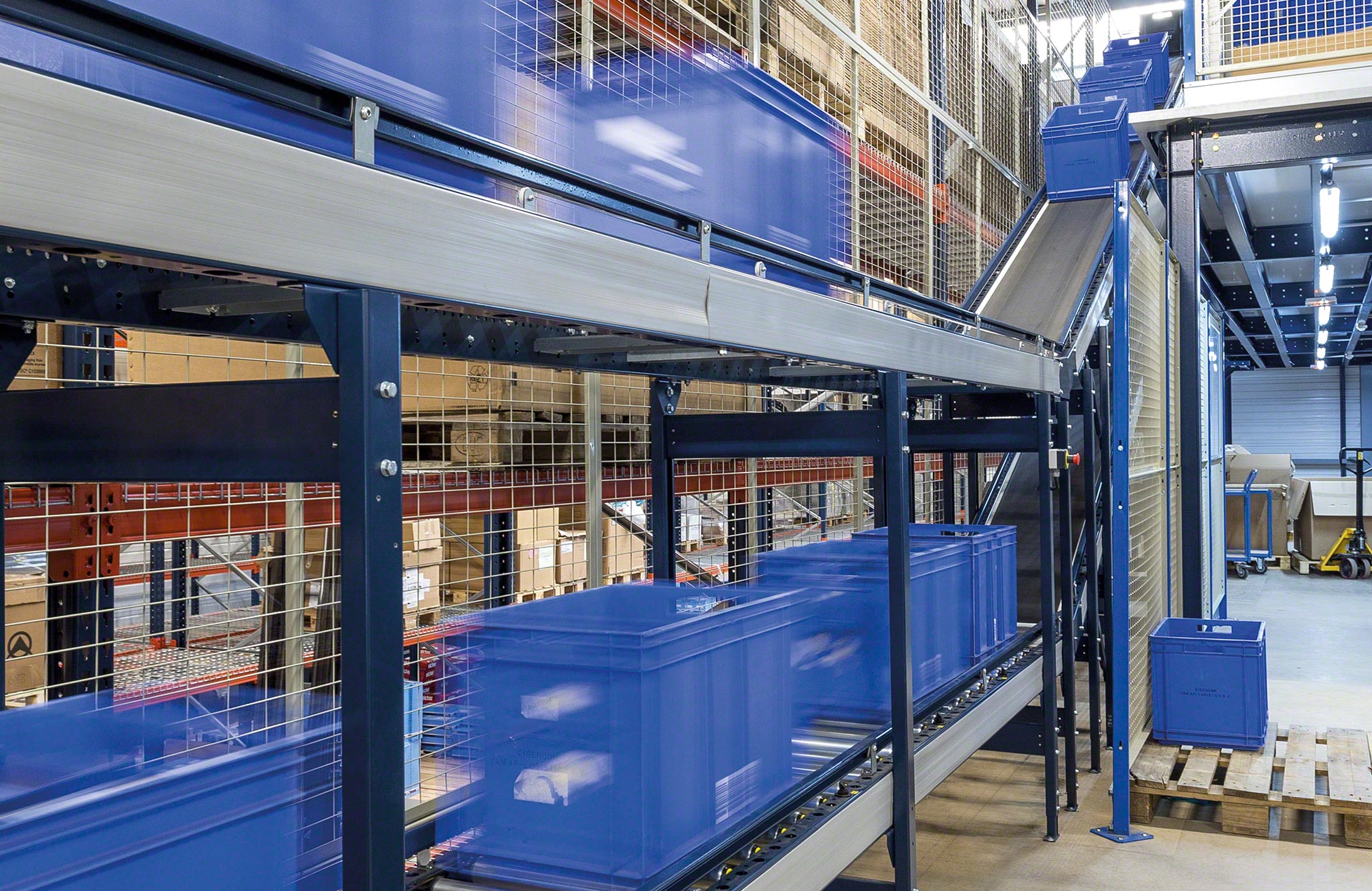 Mecalux piedāvā dažādus konveijerus kastēm un konteineriem, tostarp tādus, kas atbilst dažādām attāluma, ceļa, slīpuma, ātruma un kravas vienību prasībām. Šīs sistēmas robustā konstrukcija nodrošina augsta līmeņa drošumu dažādos darba apstākļos.