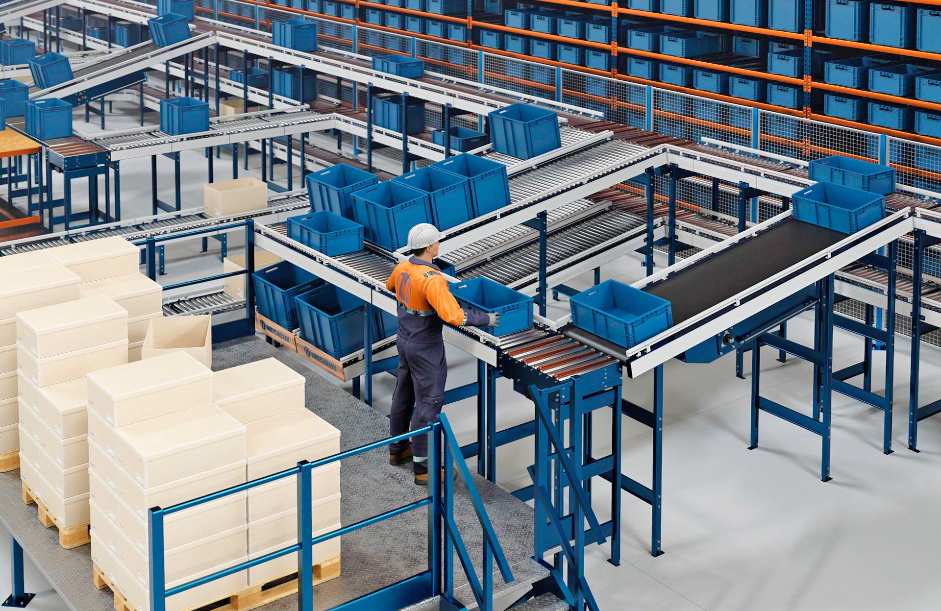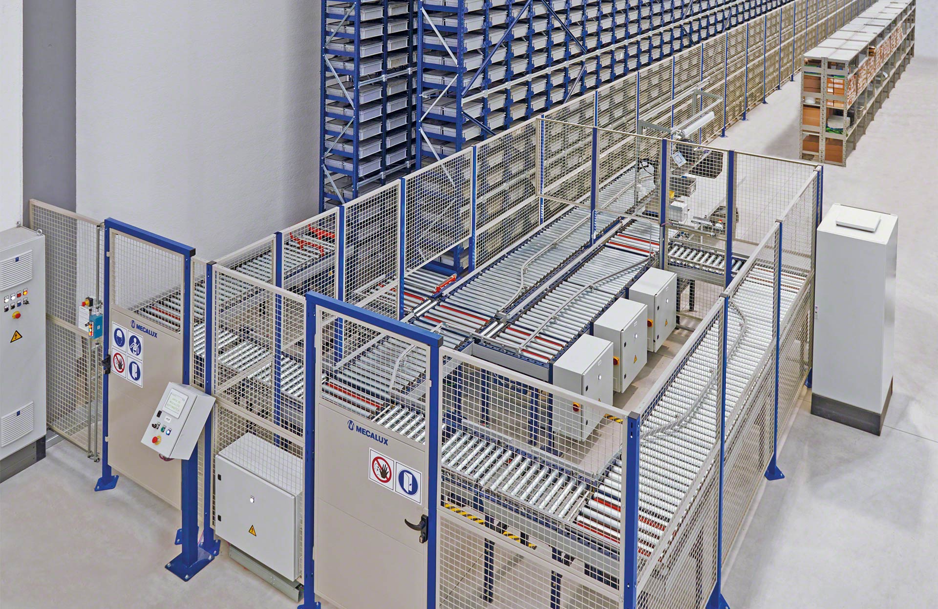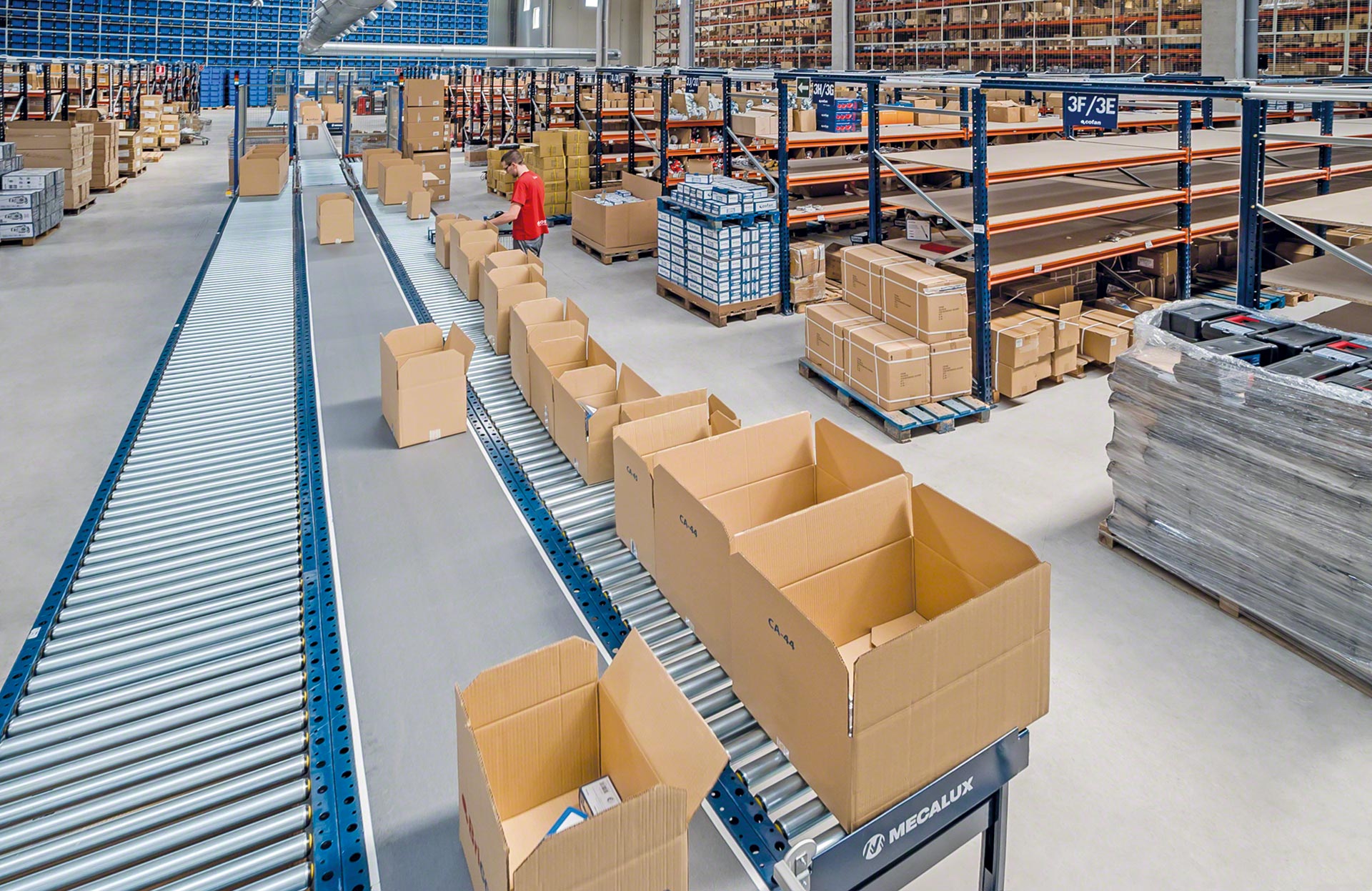 Mecalux piedāvā vairāku veidu kastu pārvietošanas sistēmas, tostarp rullīšu, lentes un jaukta veida rullīšu/zobsiksnu konveijerus kastēm. Rullīšu konveijeri kastēm pārvieto kravas vienības, izmantojot metāla cilindrus, kuri griežas uz vārpstas un kuru darbību nodrošina motors vai gravitācijas spēks. Savukārt lentes konveijeri pārvieto kastes un citas nelielas kravas vienības, izmantojot nepārtrauktu gumijas vai plastmasas virsmu, kas virzās starp diviem motorizētiem veltņiem konstrukcijas galos. Jaukta veida konveijeri ir šķērstransportēšanas ierīces, kas apvieno 90° leņķī izkārtotus rullīšus un lentes, maina transportējamo kravas vienību virzienu un orientāciju.