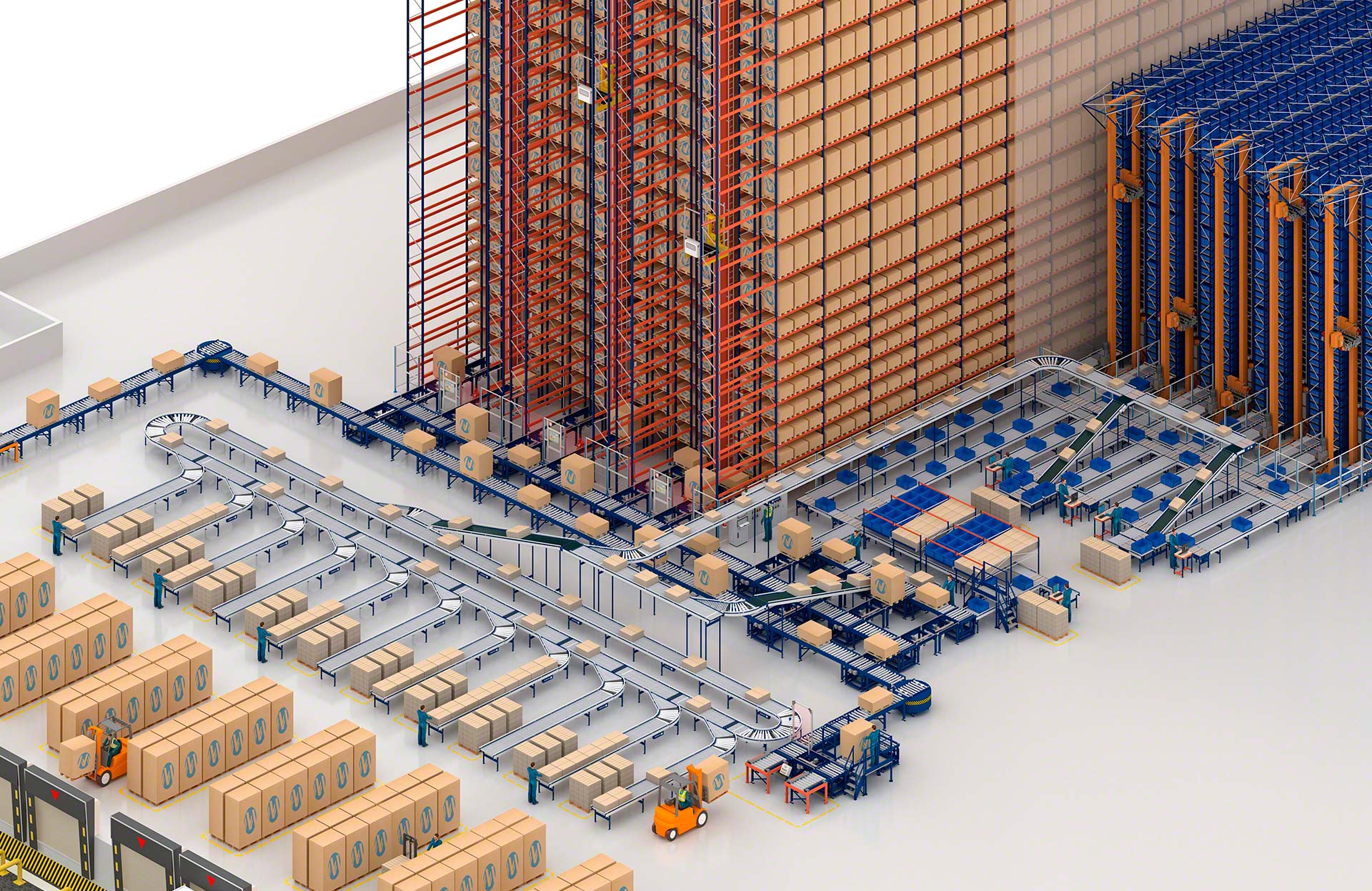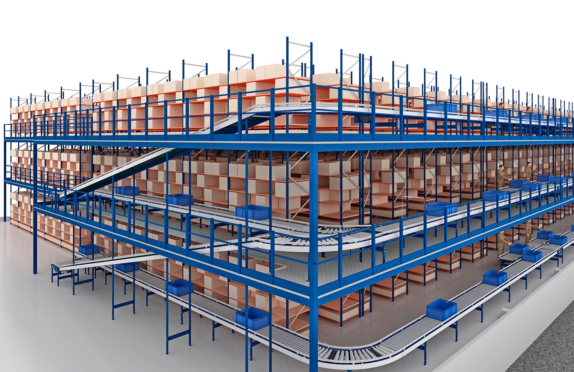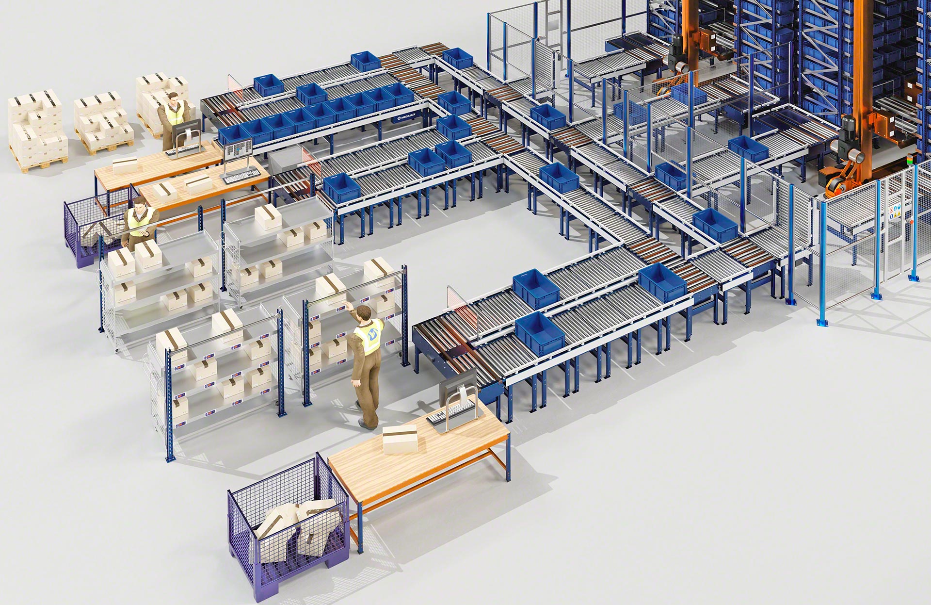 Mecalux piedāvā vairāku veidu kastu pārvietošanas sistēmas, tostarp rullīšu, lentes un jaukta veida rullīšu/zobsiksnu konveijerus kastēm. Rullīšu konveijeri kastēm pārvieto kravas vienības, izmantojot metāla cilindrus, kuri griežas uz vārpstas un kuru darbību nodrošina motors vai gravitācijas spēks. Savukārt lentes konveijeri pārvieto kastes un citas nelielas kravas vienības, izmantojot nepārtrauktu gumijas vai plastmasas virsmu, kas virzās starp diviem motorizētiem veltņiem konstrukcijas galos. Jaukta veida konveijeri ir šķērstransportēšanas ierīces, kas apvieno 90° leņķī izkārtotus rullīšus un lentes, maina transportējamo kravas vienību virzienu un orientāciju.
