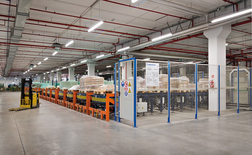 Preces no ražošanas nonāk loģistikas centrā caur paceltām platformām. Kravas automašīnu izkraušana tiek veikta ar autokrāvējiem, tāpēc paletes nonāk tieši ieejas ķēdē.