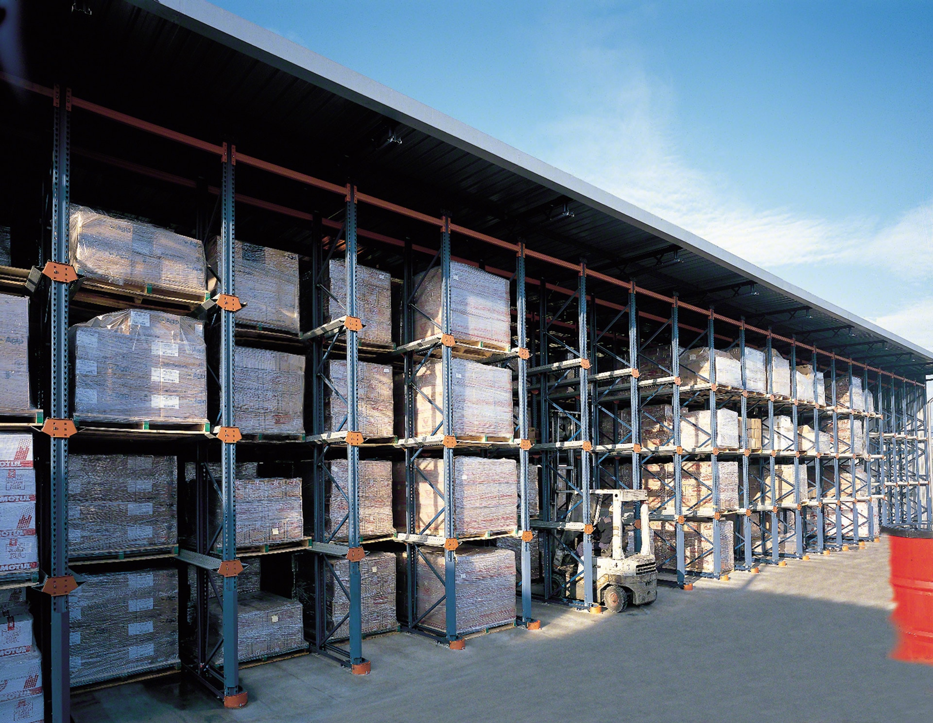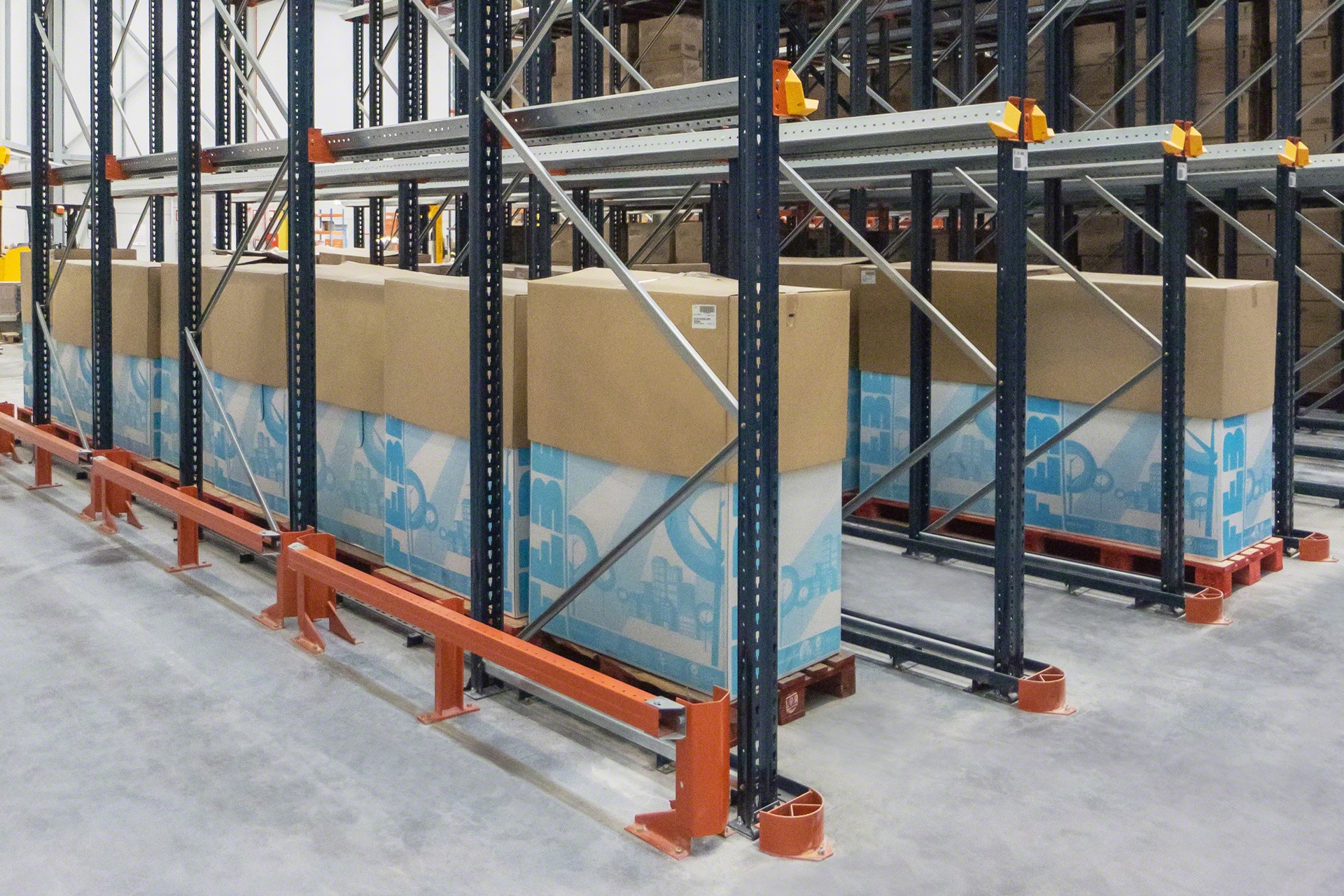 - Vadīšanas elementi: Mecalux drive-in plaukti ir aprīkojami ar piederumiem, kuri atvieglo autokrāvēju pārvietošanos un pareizu palešu pozicionēšanu.