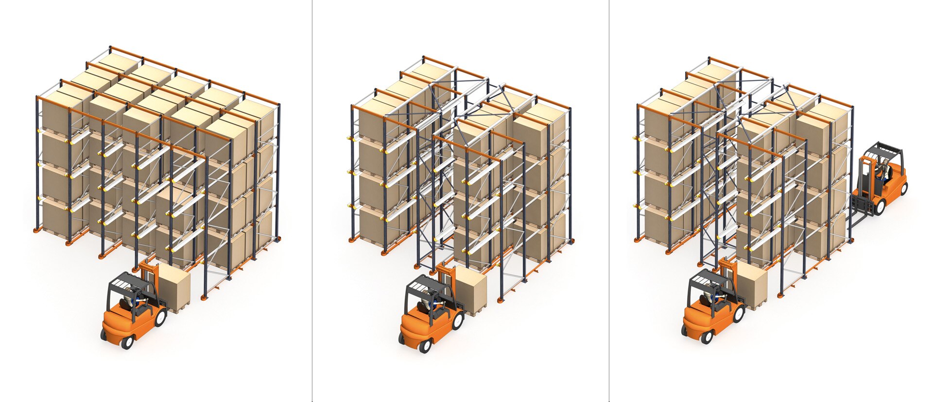 Ir pieejamas divas šo plauktu konfigurācijas: drive-in (paletes tiek iekrautas un izkrautas no vienas darba ejas) vai drive-through (paletes tiek iekrautas no priekšas un izkrautas no aizmugures).