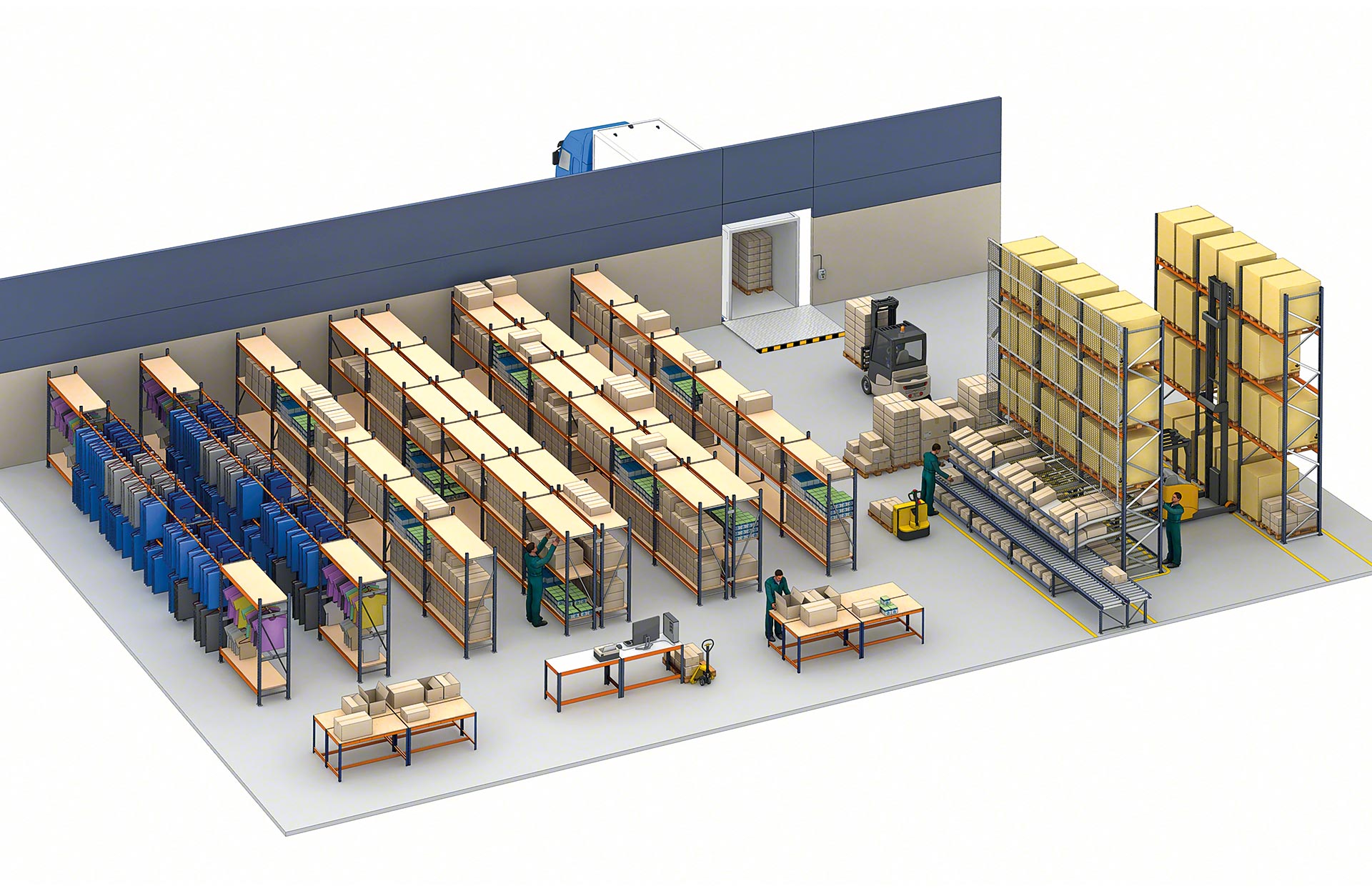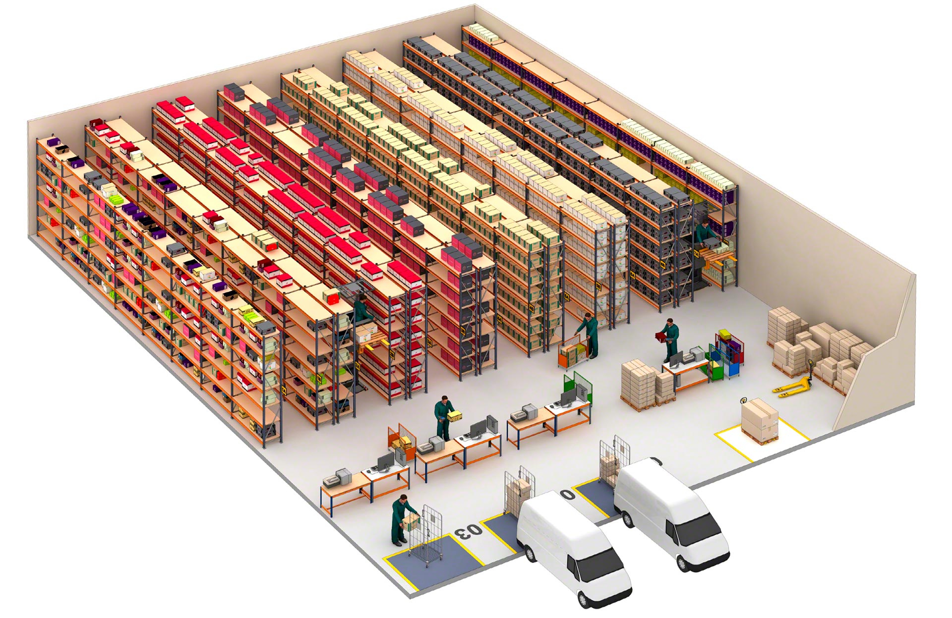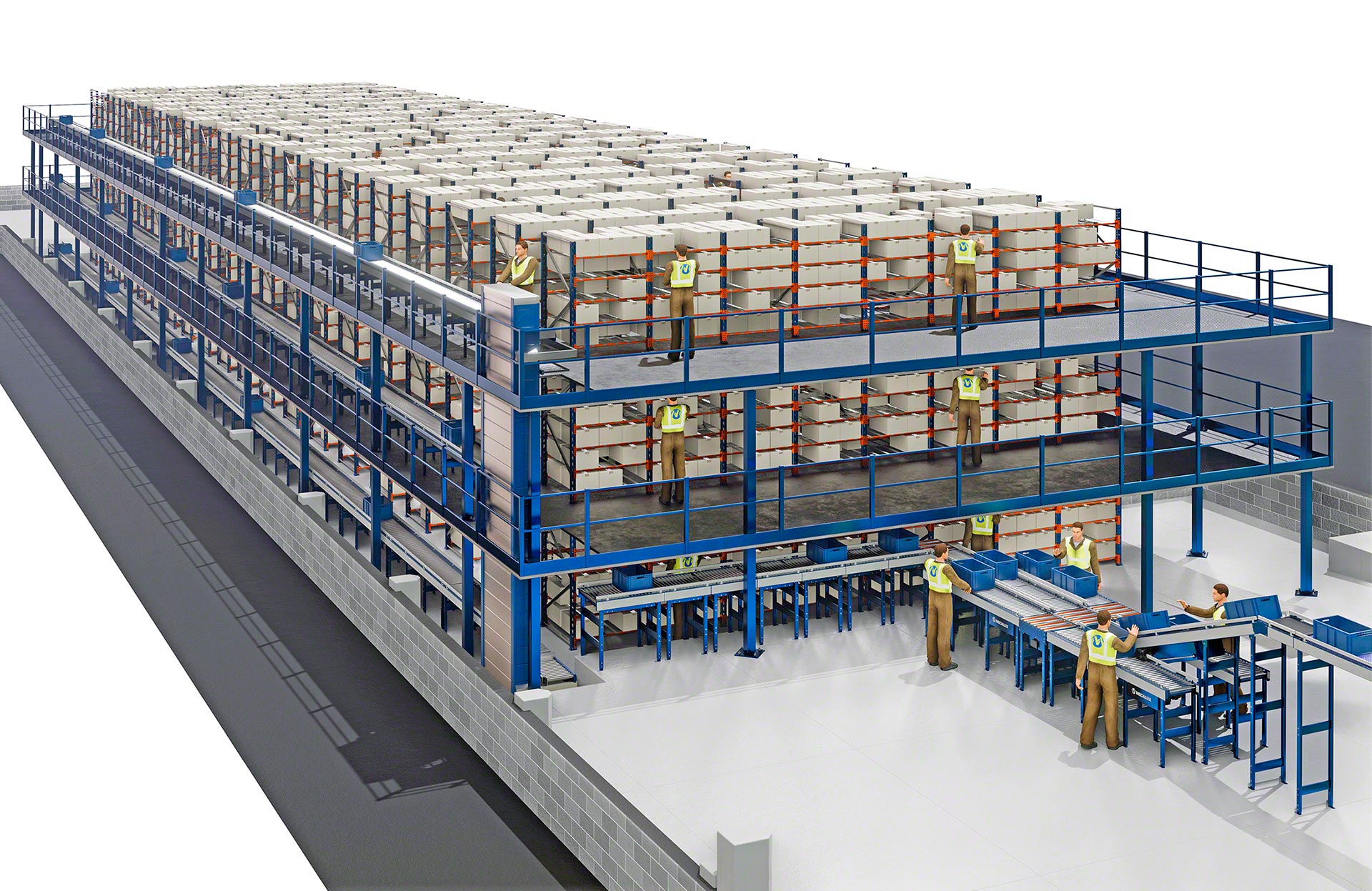- Liela augstuma uzglabāšanas kapacitāte: plauktu augstums var sasniegt līdz 12 m darbam ar pasūtījumu komplektēšanas iekārtām un līdz 20 m ar piekļuvi augšējiem līmeņiem, izmantojot paceltas pārejas.
