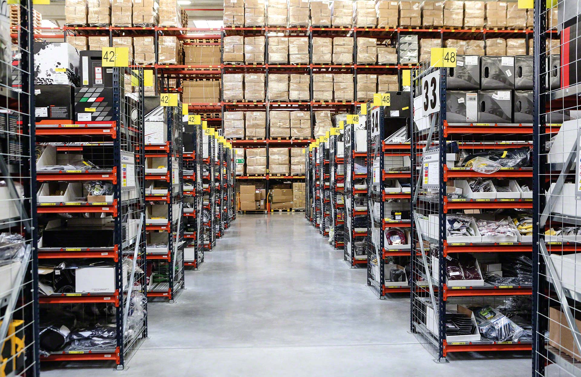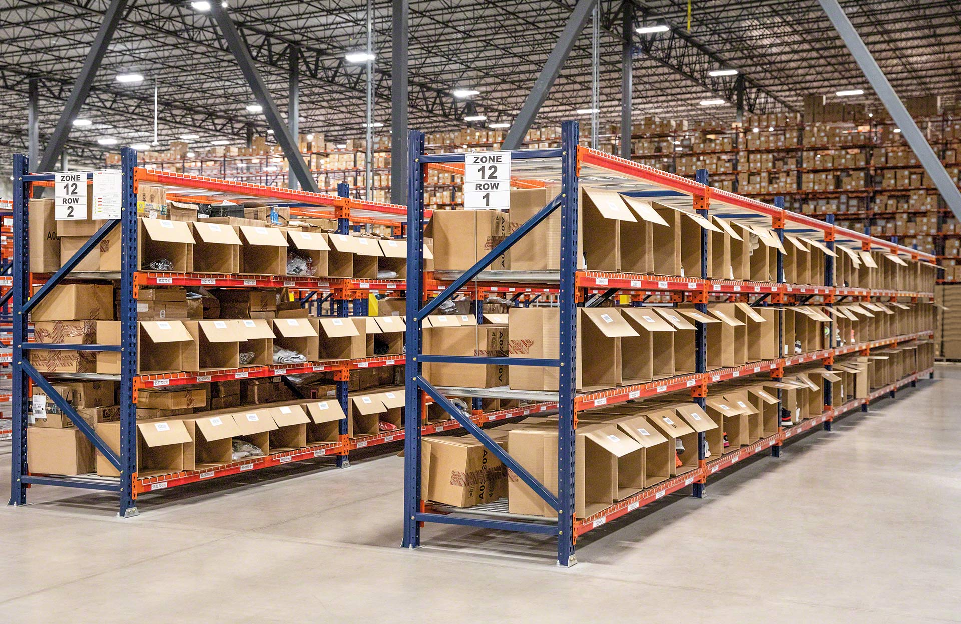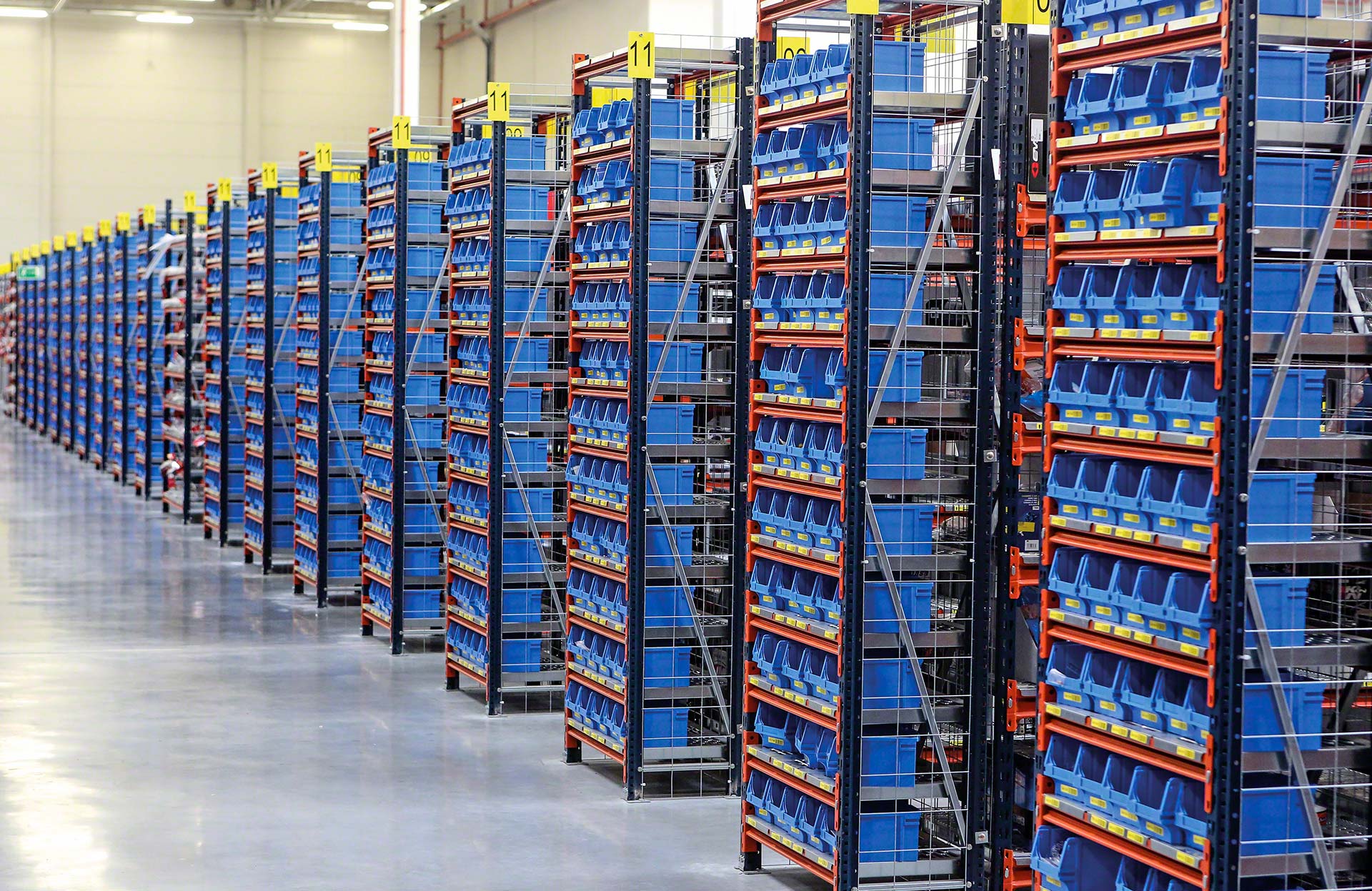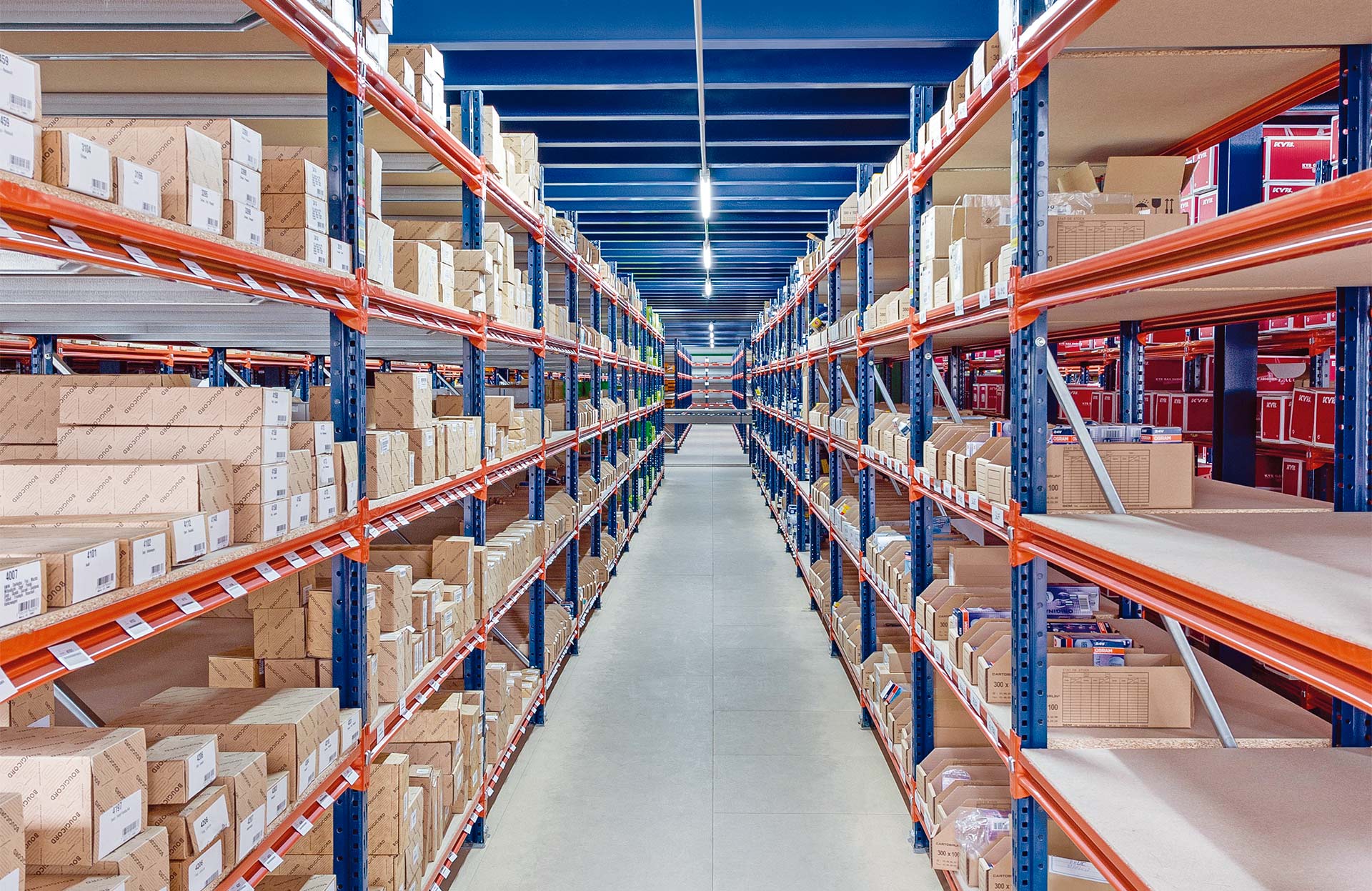 Mecalux M7M7 gara laiduma plaukti tiek plaši izmantoti komplektēšanas noliktavās, atbalstot svaru virs 1000 kg uz vienu līmeni.