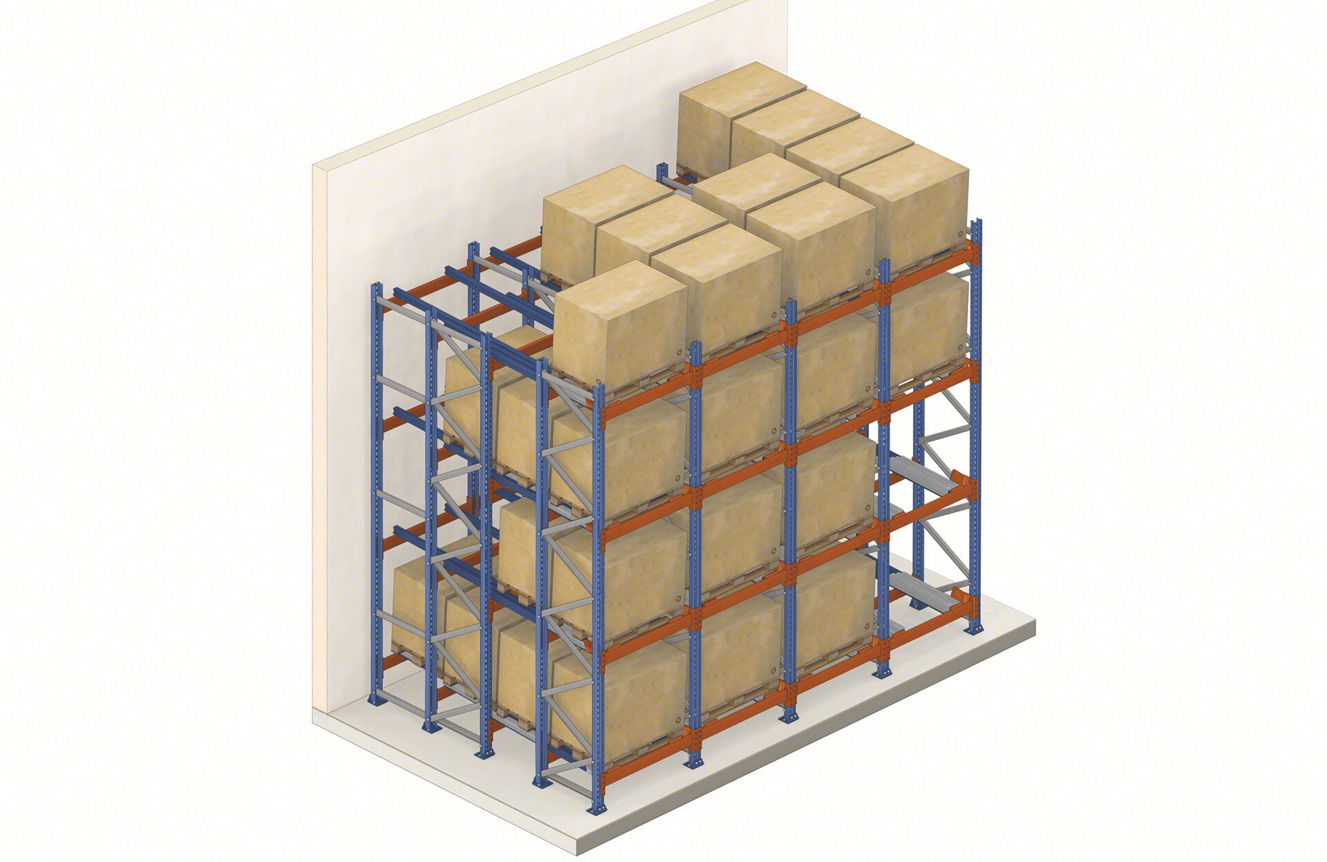 Mecalux palešu iestumšanas plauktos ar ratiņiem dziļumā var uzglabāt 2–4 paletes, savukārt variantā ar ritenīšiem var ievietot vairāk nekā četras paletes.