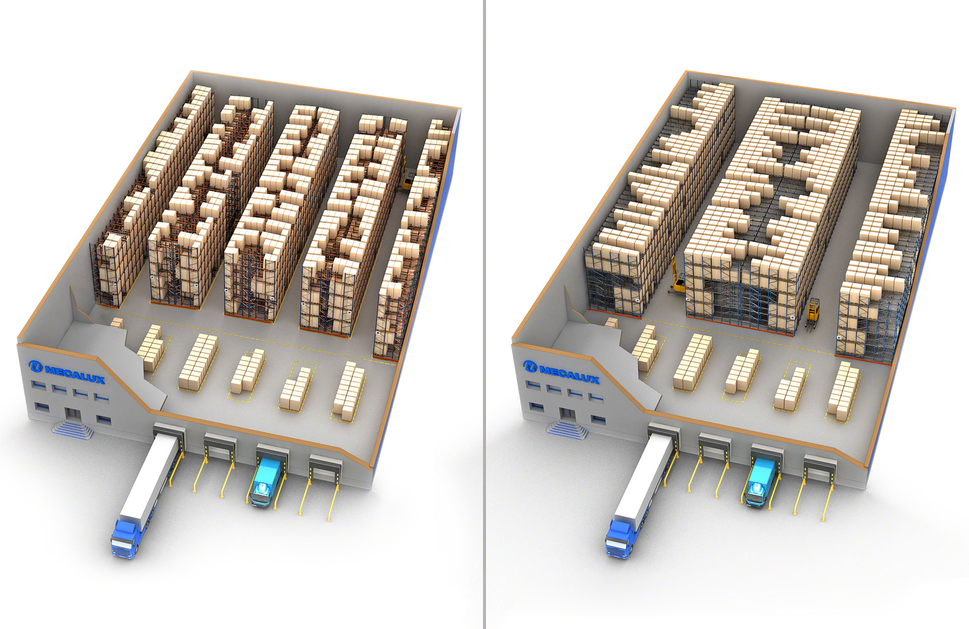 - Iegūtais laiks: iekrāvēji neiebrauc plauktu sistēmā, un darbības tiek veiktas no vienas ejas. Tas ievērojami optimizē iekraušanu un izkraušanu.