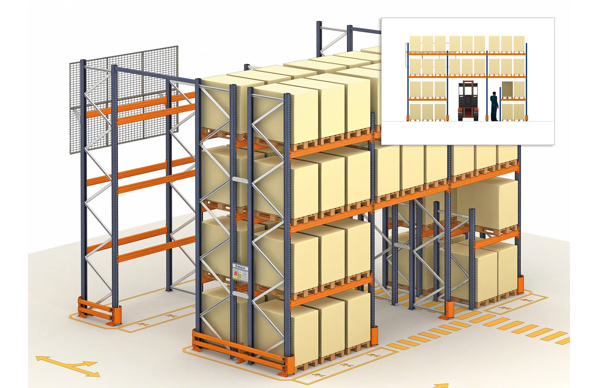 Mecalux plaukti tiek izgatavoti saskaņā ar augstākajiem palešu plauktu kvalitātes standartiem un ir aprīkoti ar vairākām drošības ierīcēm. Plaša sastatņu, siju, plauktu un balstu izvēle ļauj izveidot noliktavas, kas ir pielāgotas visprasīgākajām vajadzībām.
