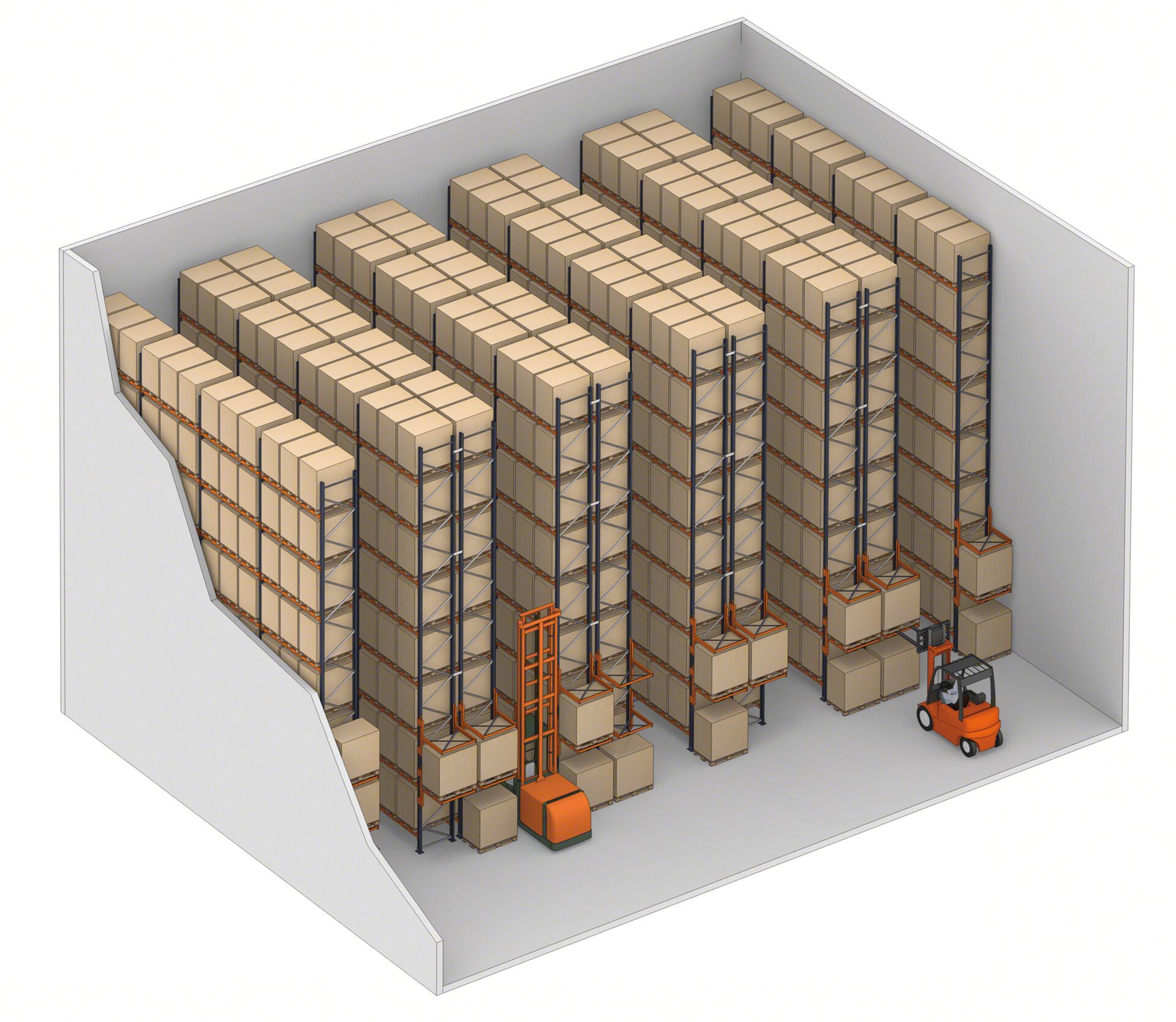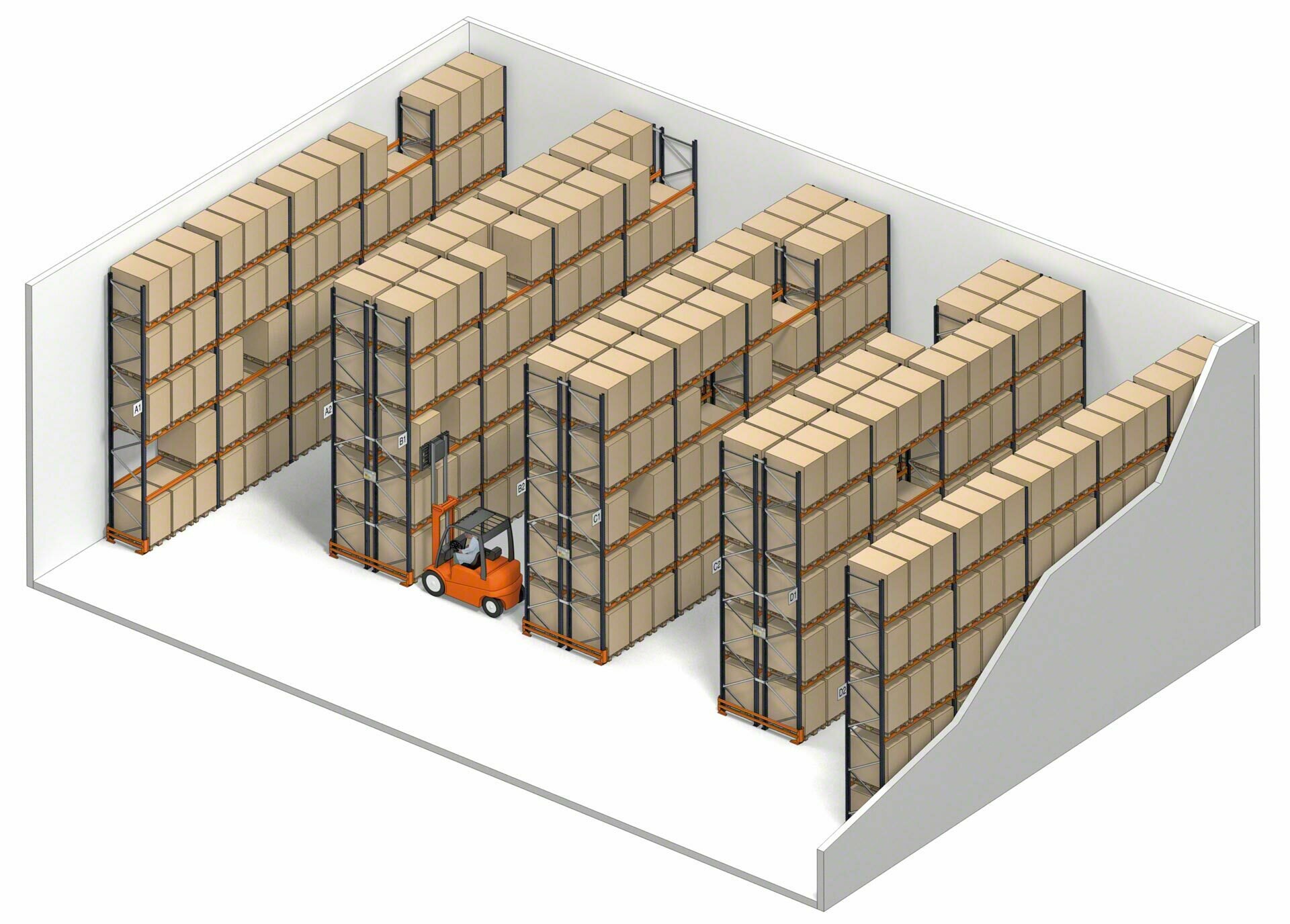 - Piemēroti komplektēšanai: darbinieki var veikt komplektēšanas uzdevumus grīdas līmenī (vai uz plauktu apakšējiem līmeņiem). Preces var noņemt arī no augstākām vietām, izmantojot komplektēšanas ierīces.